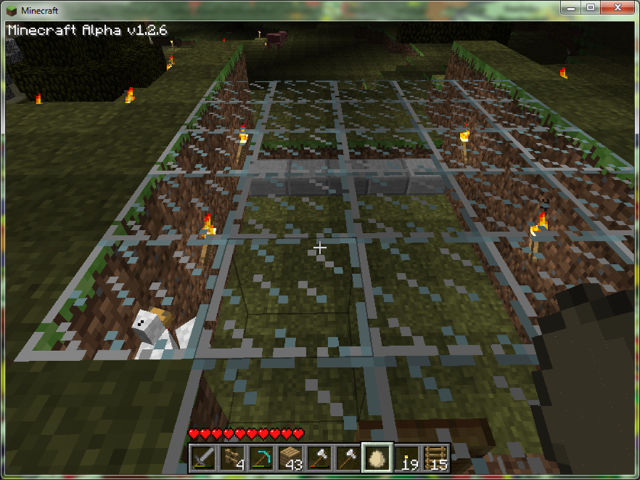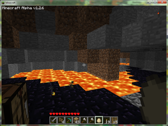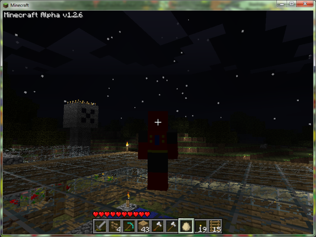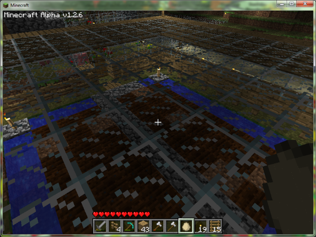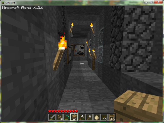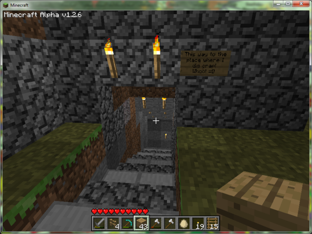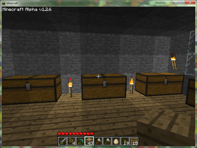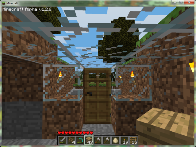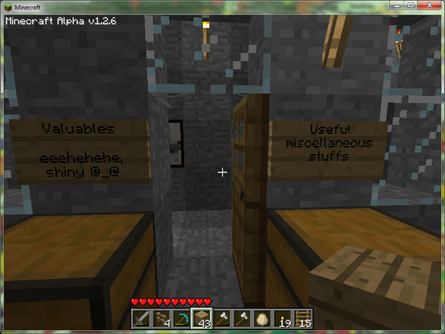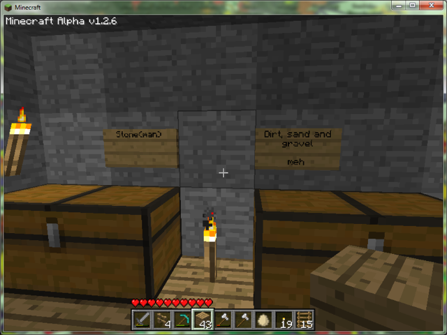 The inside! Not terribly fancy or anything, but it gets the job done. Or rather, it did, before I promptly stopped using it and started making my base larger. I still remember when it was a tiny, cramped little space and I had to block off the entrance with dirt. I have fond memories of clearing said dirt one morning to find a Creeper staring directly into my face. I then promptly shoved the dirt back where it was and sat in the corner of my base gently rocking backwards and forwards.
