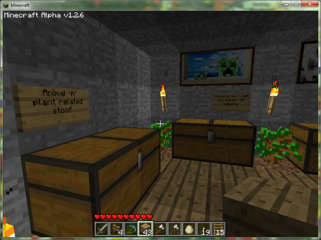 My storageroom because I was getting fed up of having chests scattered all over the place with random bits and bobs in them. The plants are to make the room look nicer.